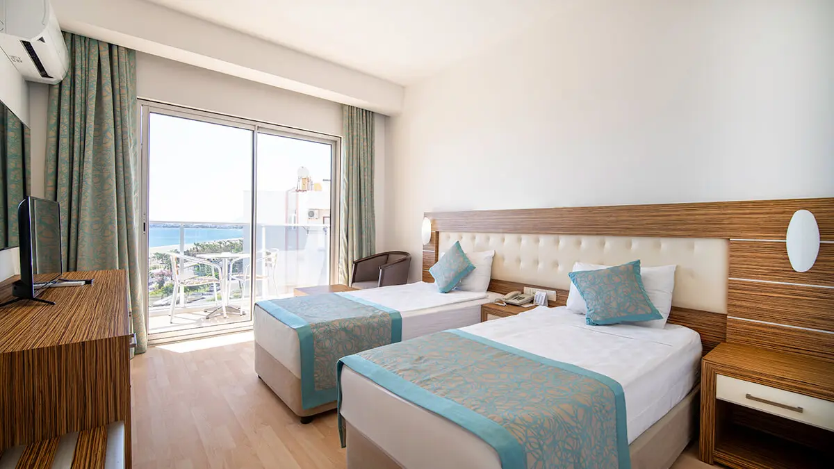 В со вкусом обставленных комнатах; В номере есть ванная комната, туалет, ванна или душ, фен, телефон в ванной комнате, сплит-система кондиционирования воздуха (тепло-холод), ЖК-телевизор со спутниковым подключением, музыкальный канал на ТВ, телефон, мини-бар, электронный сейф и балкон. Полы в комнатах на первом этаже выложены керамикой, на остальных этажах — паркетом. Из всех номеров открывается вид на море или бассейн. Из некоторых номеров с видом на море открывается великолепный вид на крепость Алании.